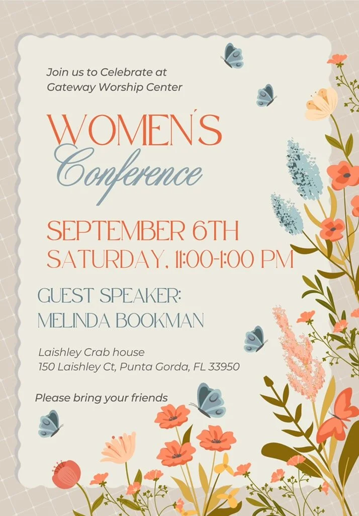 Calling all ladies to join us at our Women’s Conference, which will be held on Saturday, September 6th, from 11:00 AM to 1:00 PM at Laishley Crab House in Punta Gorda. The sign-up sheet will be in the foyer, and for any questions, please see April Bailey or Erica Leal.